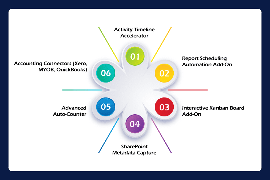 - Yes — all key add-ons such as Report Scheduling Automation, Interactive Kanban Board, Activity Timeline Accelerator, SharePoint Metadata Capture, Accounting Connectors, and Advanced Auto-Counter can be customized to suit your business processes.